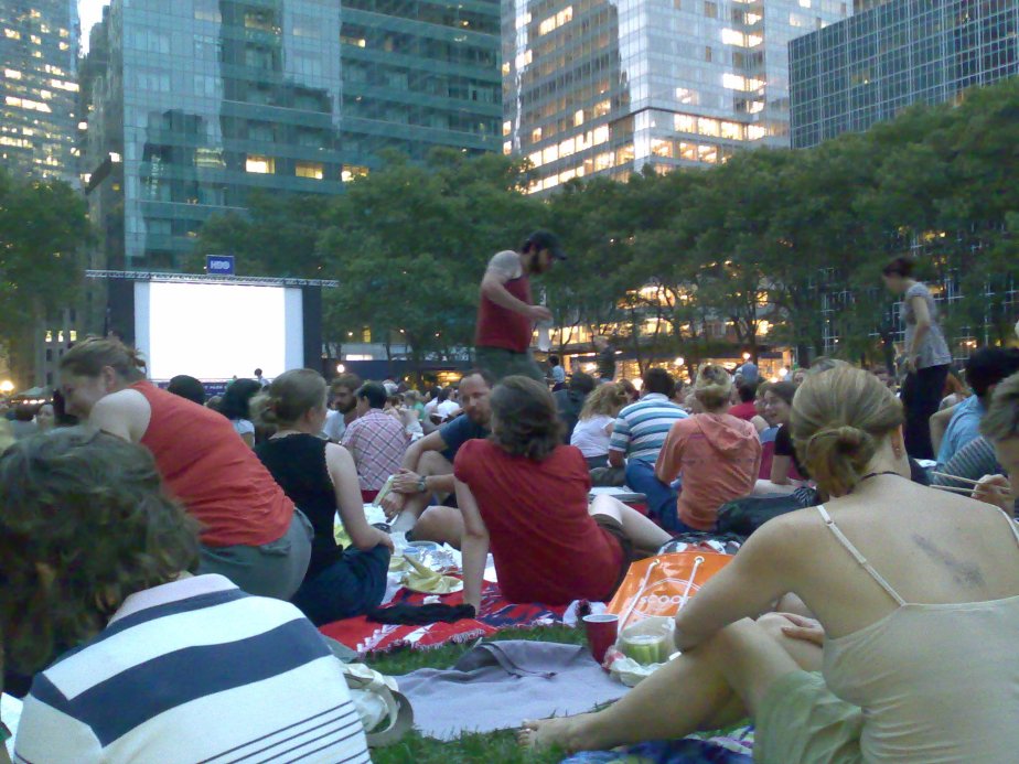 Auch andere Sommeraktivitäten sind – wenn es sie überhaupt gibt – in New York weniger angenehm als in Wien. Nehmen wir nur einmal Freiluftkinos. Auch im Big Apple gibt es solche. Einer der bekanntesten Schauplätze hierfür ist der Bryant Park, bekannt vor allem durch die dort stattfindende Fashion Week. Die Stadtväter errichten eine Leinwand und laden – kostenfrei – zum Kinobesuch. Jüngst nahmen mich ein paar