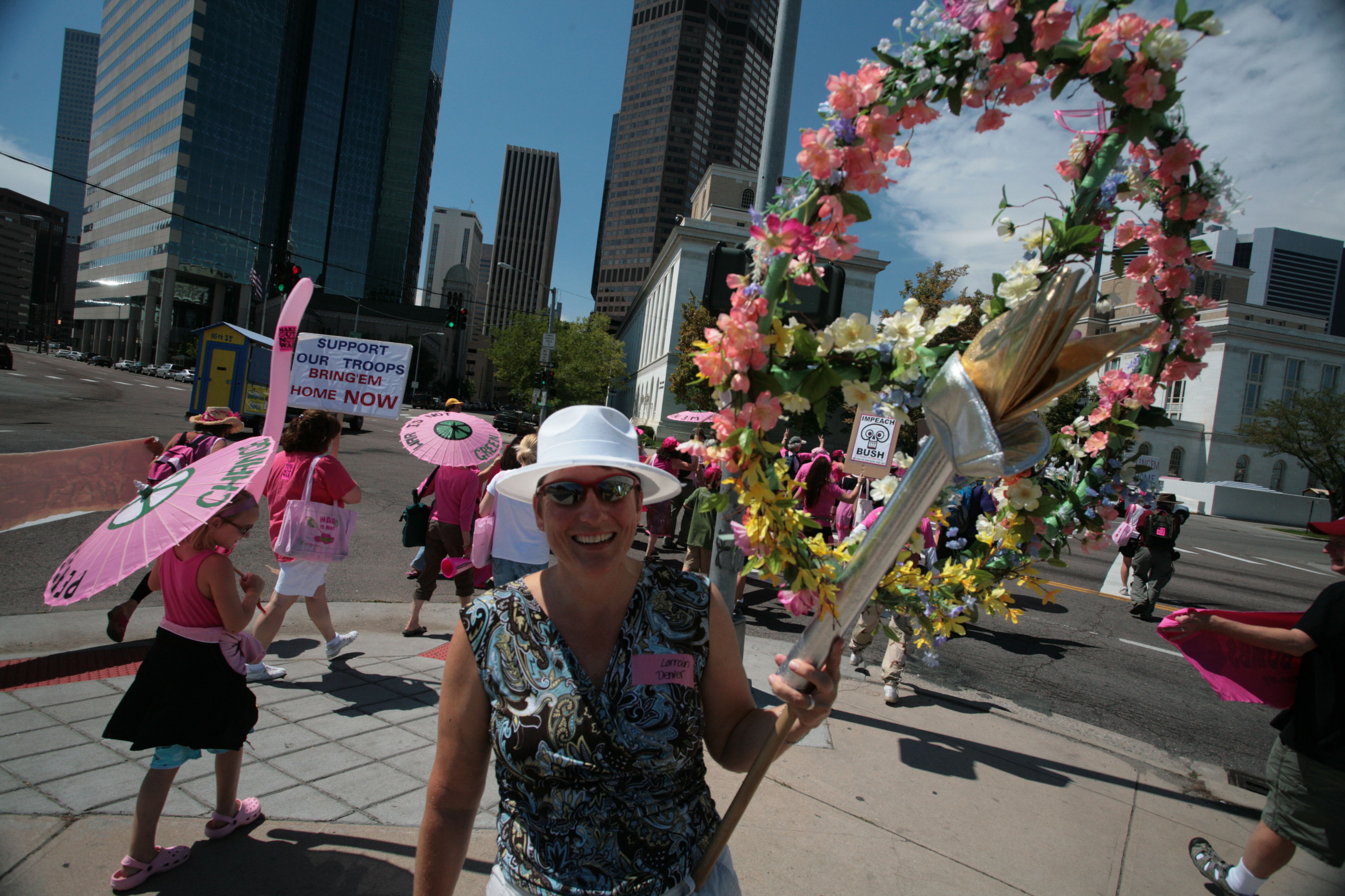 Wie harmlos wirkt dagegen das Grüppchen rosa gekleideter Damen von Code Pink, die sich im Mercury Café in der California Street, für ihren Marsch bereit machen. Vor dem Ziegelbau mit den Graffiti, der ein bisschen an die Wiener Arena erinnert, fertigen sie Transparente und bestücken Friedenszeichen mit Plastikblumen. Um elf Uhr machen sie sich auf in die Innenstadt. Unterwegs skandieren sie Parolen wie „Out of the shops – into the streets“ und „Bush – McCain all the same – all insane“. Die 74-jährige Barbara Briggs-Letson, Großmutter von sechs Enkelkindern, ist eigens aus San Francisco angereist, um – wie sie sagt „der Friedensbotschaft mehr Gehör zu verschaffen“: „Ich will nicht, dass einer meiner Enkel eines Tages in einem sinnlosen Krieg sein Leben lassen muss.“