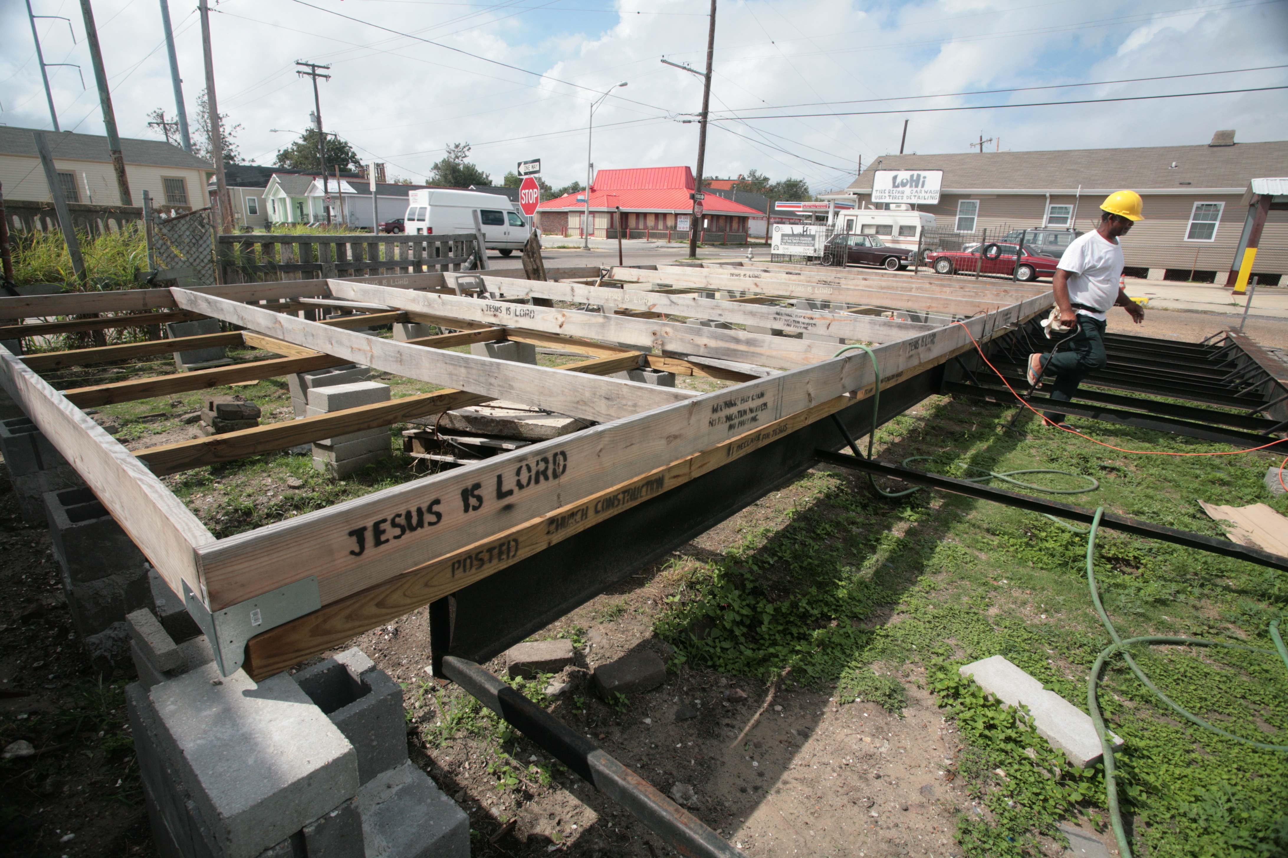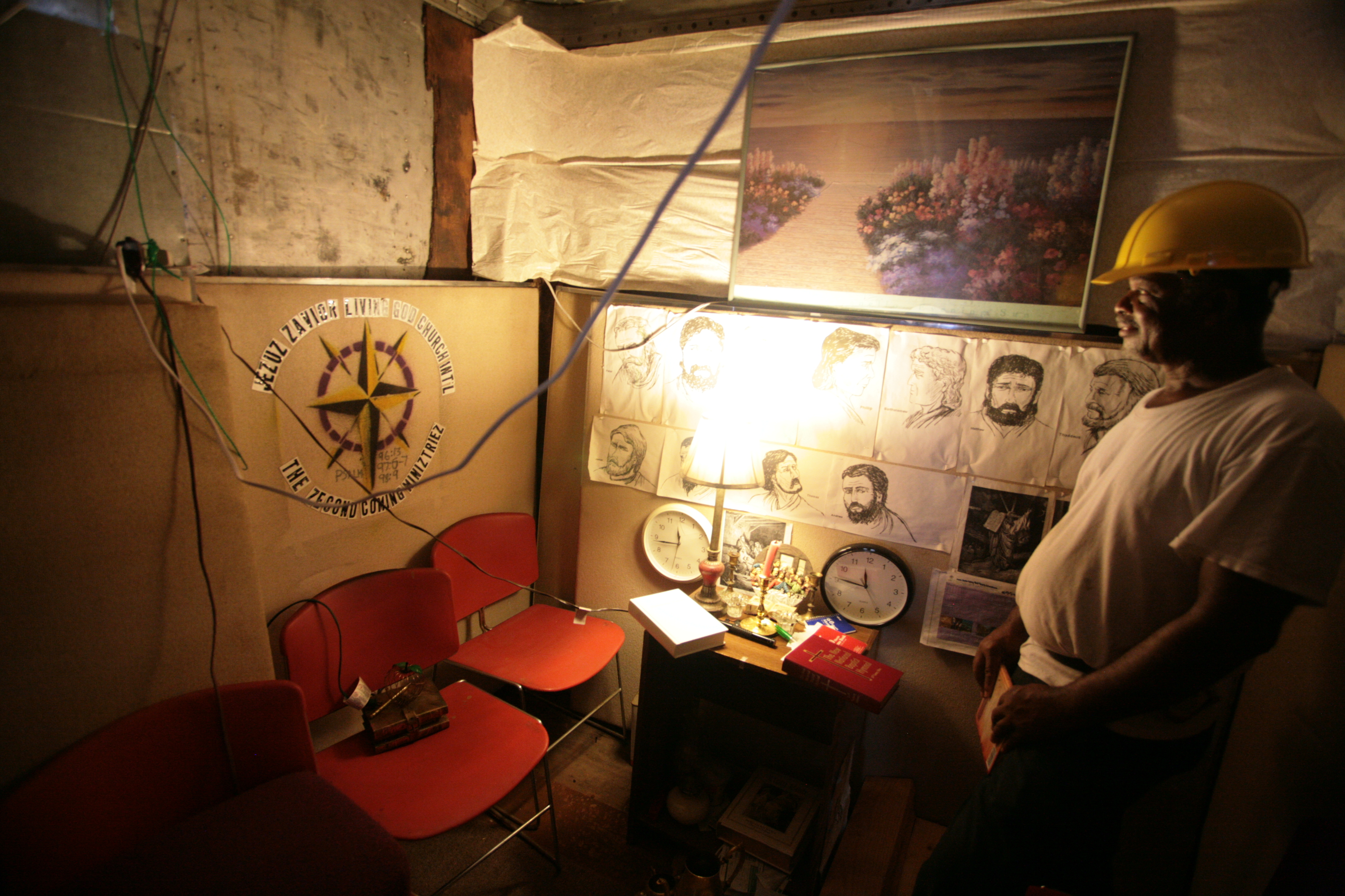 Ich begegnete Dodiyi Williams, als ich zwei Stunden durch die Gassen des 9th Ward geirrt war. Der 73-jährige Prediger hämmerte Nägel in ein Holzfundament. Jeden einzelnen Balken hatte zuvor mit einem kleinen Glaubensbekenntnis versehen. Williams, der einen gelben Bauarbeiterhelm trägt, kam einen Monat, nachdem Hurrikane Katrina und die Hochwasser des Mississippi sein Gotteshaus dem Erdboden gleich gemacht hatten, wieder in die Stadt zurück. Seit September 2005 lebt er in einem Lkw-Anhänger, der ihm als Werkstatt, Schlafplatz und Kapelle dient. Wir balancieren durch ein Wirrwarr aus Holzlatten, Werkzeugen, Farbdosen und Papier. Vorbei an einer schmalen Pritsche und an zwei Kübeln, die ihm als Waschgelegenheit dienen. Bis ganz nach hinten gehen wir, wo gezeichnete Portraits an der Wand hängen, die er als Portraits der zwölf Apostel bezeichnet.