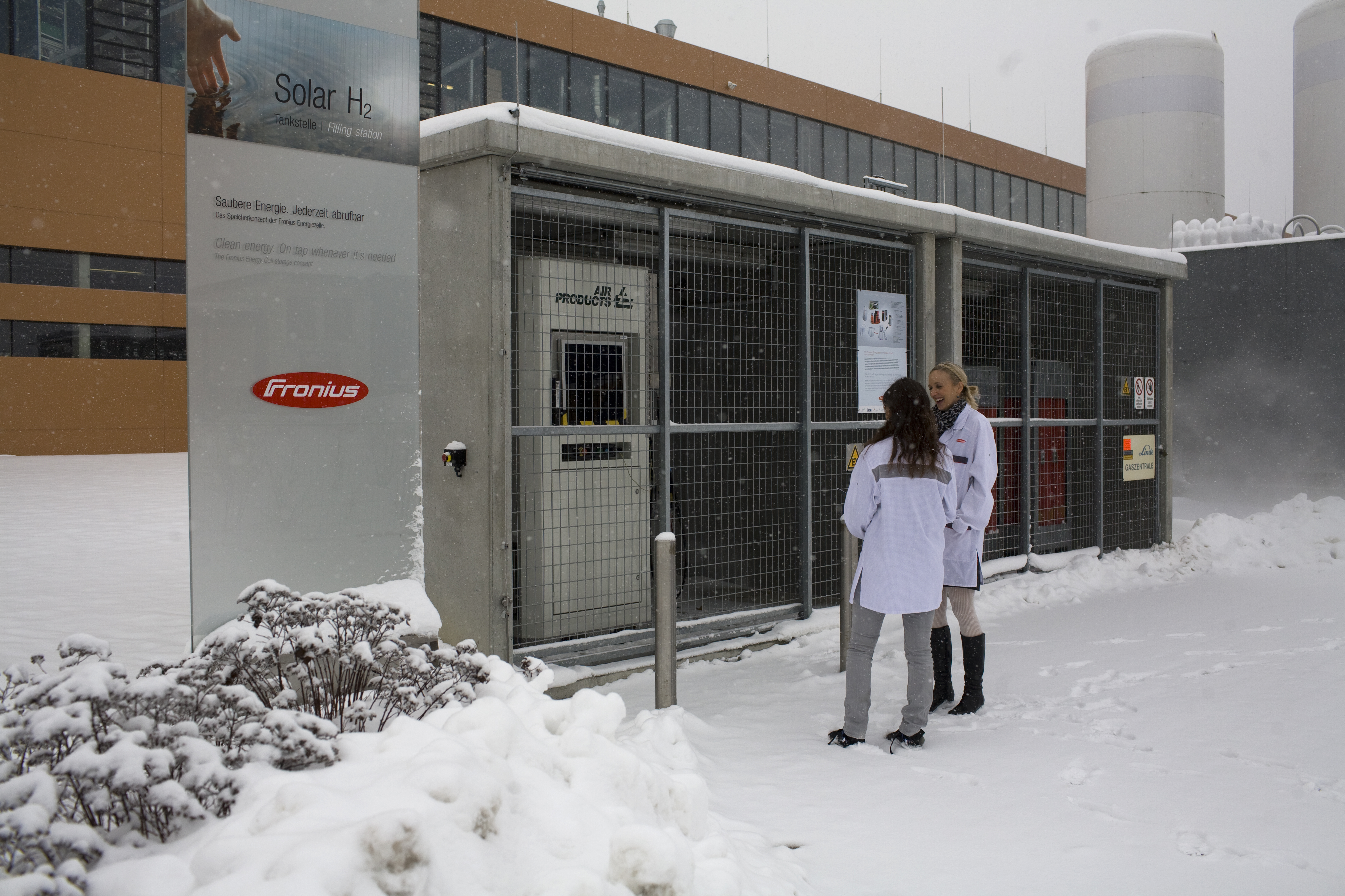 Bei der Kiste im Schauraum des Fronius-Werks in Sattledt handelt es sich um eine Brennstoffzelle, die Strom aus Sonnenlicht in Wasserstoff umwandelt, um die Energie solcherart zu speichern. Revolutionär ist diese Technik, weil damit die größte Schwäche erneuerbarer Energiequellen beseitigt wird.